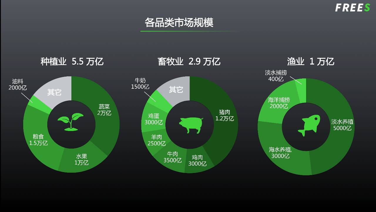 ▲ 农产品品类大致可以按照种植业、畜牧业、渔业划分,加起来大概是一个10万亿的市场。(图中规模为产地价,即农产品在生产者所在地的交易价格。)