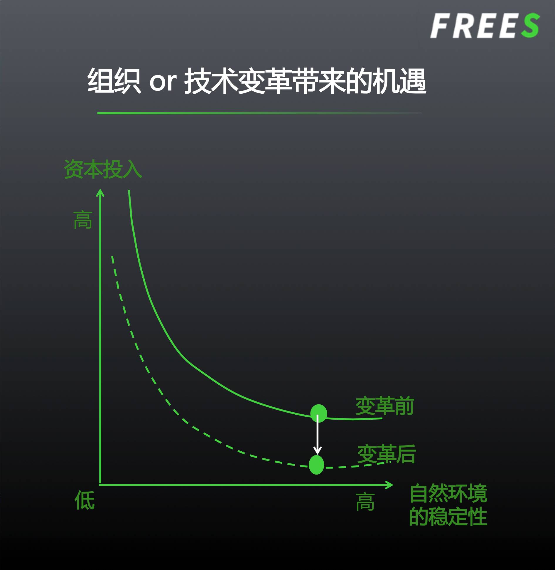 如图所示,自然环境稳定性越高,生产单位产量农产品所需的资金成本就越低。如果自然环境稳定性保持不变,但该农产品品类实现了技术升级或组织变革,那么生产单位产量农产品所需的资金成本将整体降低(由实线变为虚线)。