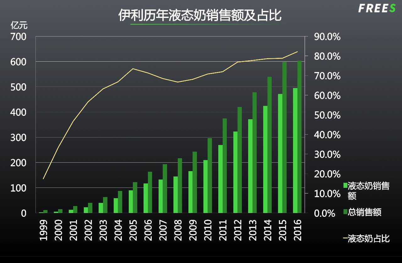 短短时间内,伊利将盒装牛奶销往全国各地,由地方性企业崛起成为中国乳业巨头。2000 年,伊利液态奶收入达 5 亿元人民币,而2015 年时,伊利年营业收入已突破 600 亿元人民币,其中 80% 由液态奶贡献。