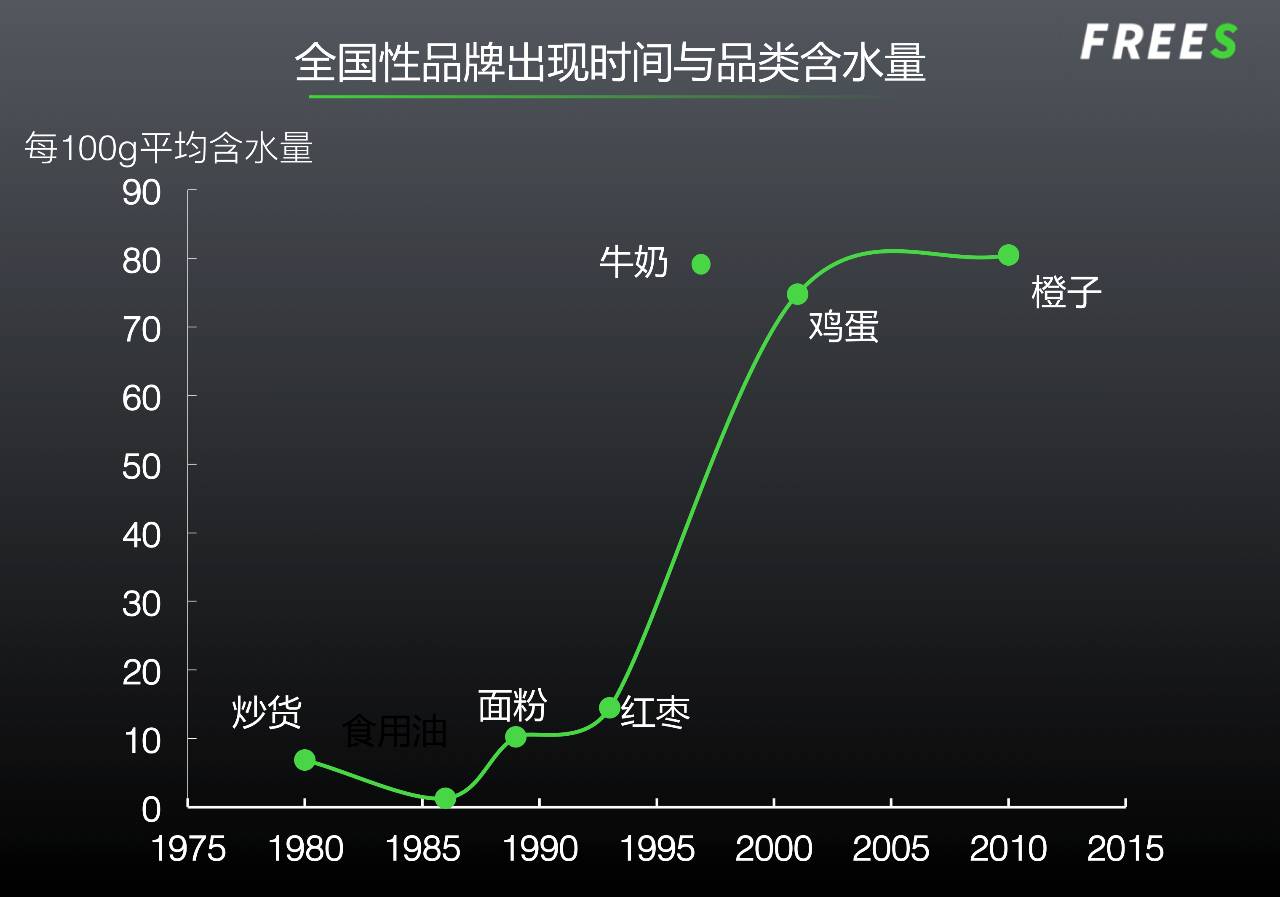 ▲ 含水量较低的品类,出现全国性品牌的时间较早。