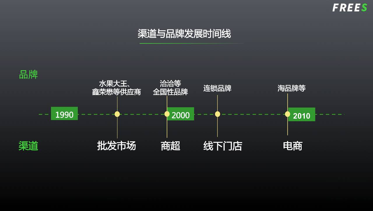 90 年代中期,各类蔬菜、水果大王的崛起得益于中国最大的蔬菜、水果批发市场「新发地」的出现;2000 年前后崛起的一批生鲜供应商巨头,则与沃尔玛、永辉超市等商超渠道的出现关系紧密。(本文仅讨论 C 端品牌,但该规律同样适用于 B 端品牌。)