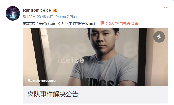 5月17日,“二冰”发表微博《无耻的队友》(现已删除)引爆了整个DOTA圈。