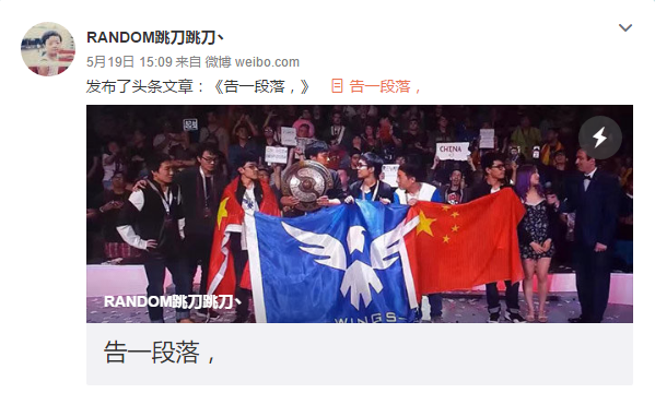 前两天我在微博发了一段长文,那是y的原话。当时我只是觉得气愤,觉得被兄弟背叛,想要发泄,想让大家知道。但之后的节奏确一发不可收拾,我的本意只是发泄自己心中的不满,没想到竟牵连了很多无辜的俱乐部和选手被带节奏。在此,我向大家说一声对不起,希望大家不要再带其他俱乐部和选手的节奏了。同时,也提前预祝中国所有的队伍能够在接下来的各大赛事中取得好的成绩,打破奇数年的魔咒。 这件事还是源于基辅之后我们几个选择了休息一段时间,而在这段时间内我们没能好好沟通导致的。之后的晚上我们5个一起好好的聊了聊,也都敞开了心扉,解除了隔阂,大家依旧是好兄弟。祝愿四个兄弟以后的职业路越走越好,取得更多好的成绩。 这次的离队事件,是我们一起商量之后共同作出的决定。但是年轻的我们并没能够考虑周全,结果就是导致了这一系列的俱乐部、联盟,以及选手之间的纠纷。在这我要再向粉丝们道一声对不起,那支wings到此就告一段落了,谢谢粉丝们一直以来的支持和喜爱,我们依旧热爱DOTA,依旧想要再站在职业的舞台之上。 经历了这段时间的各种事和这半年多以来的糟糕的比赛成绩,不管是对于粉丝还是我自己,我想我都应该休息一段时间来好好调整自己的心态和状态了。调整好之后,相信我会以更好的状态回归赛场。 最后谢谢一直以来支持和喜爱我的粉丝和朋友们,谢谢你们!