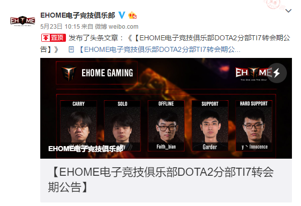 5月23日,Ehome电子竞技俱乐部官方微博宣布y`和Faith_bian正式加盟Ehome战队。