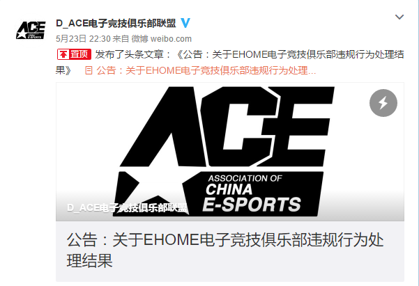 随后,D_ACE电子竞技俱乐部联盟官方微博发表声明,Ehome战队在选手转会交易过程中存在严重违规行为,并且无视联盟警告,联盟决定将Ehome战队逐出联盟,并且拒绝以后Ehome战队的加入申请。