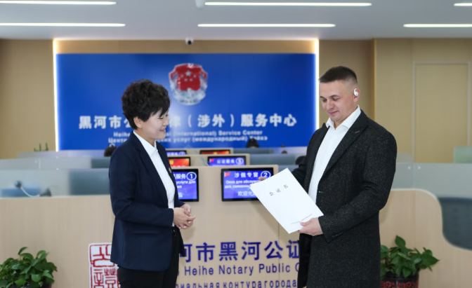 入境俄公民仅需前往黑河市黑河公证处一次,在提交护照、驾照翻译公证所需材料的同时,授权公证处代为领取公证书,再由公证处直接将公证书及相关申请材料流转至黑河市公安局交管部门服务窗口,交管部门审核通过后,申请人即可到交管部门完成后续身份核验,直接领取《临时驾驶许可》。