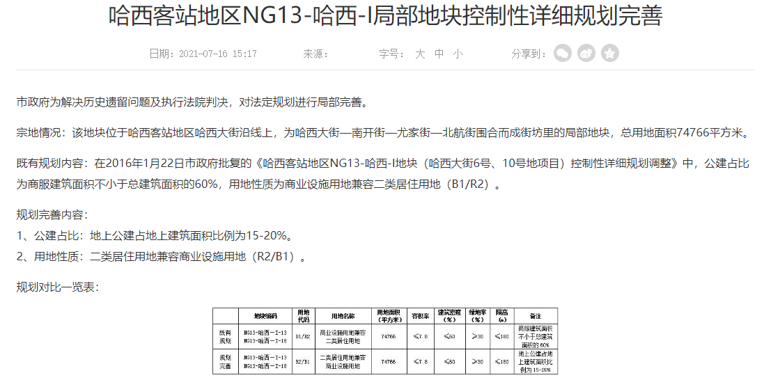 为盘活这个停工多年的项目,2021年7月16日,哈尔滨市人民政府网站发布了《哈西客站地区NG13-哈西-I局部地块控制性详细规划完善》公示。公示显示,市政府为解决历史遗留问题及执行法院判决,对法定规划进行局部完善,这次调整也为项目重启奠定了基础。