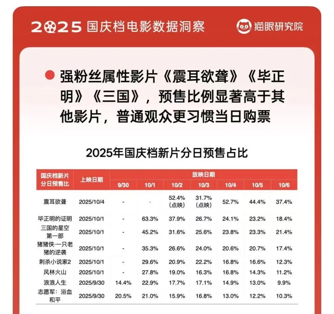而《震耳欲聋》《毕正明的证明》《三国的星空第一部》预售占比较高,主要得益于檀健次、王安宇粉丝,被猫眼研究院定义为“强粉丝属性电影”。