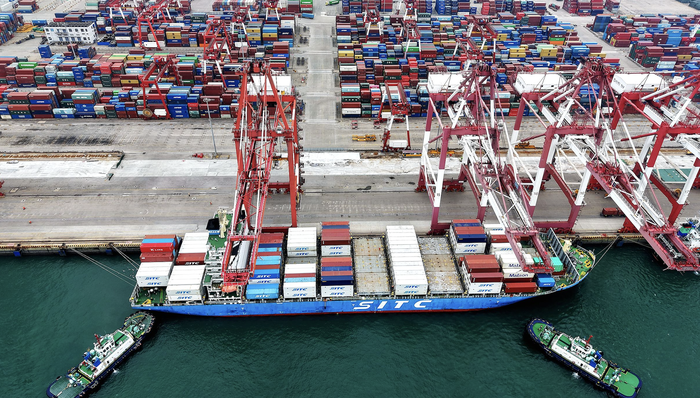 2025年10月11日,山东青岛,山东港口青岛港一艘装载外贸集装箱的货轮停靠泊位。图片来源:CFP
