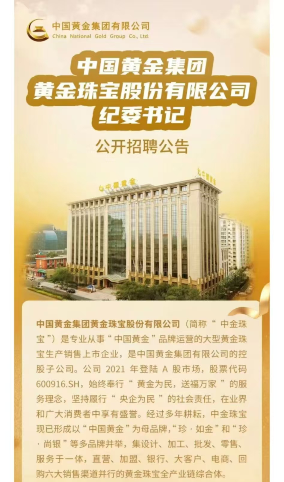 中国黄金集团10月12日晚间发布消息称,其所属企业中国黄金集团黄金珠宝股份有限公司(股票简称中国黄金,600916.SH)拟公开招聘一名纪委书记。