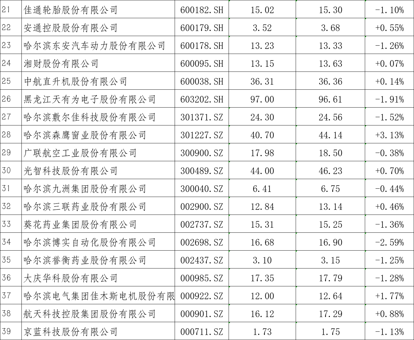 黑龙江省39家A股上市公司今日表现如下