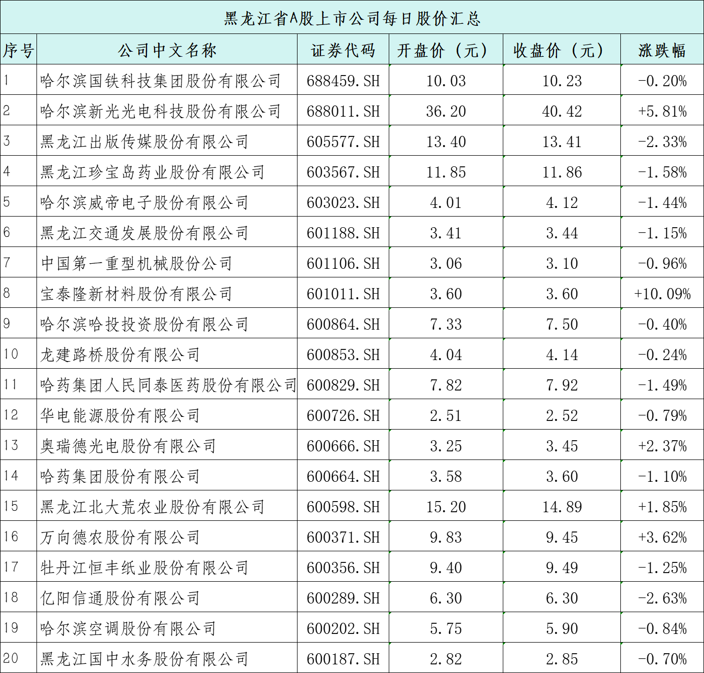 黑龙江作为我国东北地区的重要经济支柱,其资本市场动态备受关注。本文表格每日更新,汇总黑龙江省主要A股上市公司的开盘价与收盘价。数据来源为公开证券市场统计,仅供参考,不构成投资建议。投资者据此操作,风险自担。