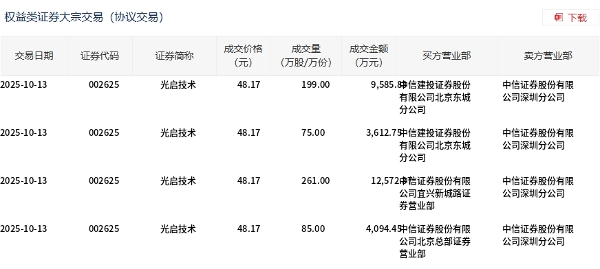 10月13日,光启技术大宗交易成交620万股,成交额2.99亿元,占当日总成交额的12.35%,成交价48.17元,较市场收盘价49.4元折价2.49%。