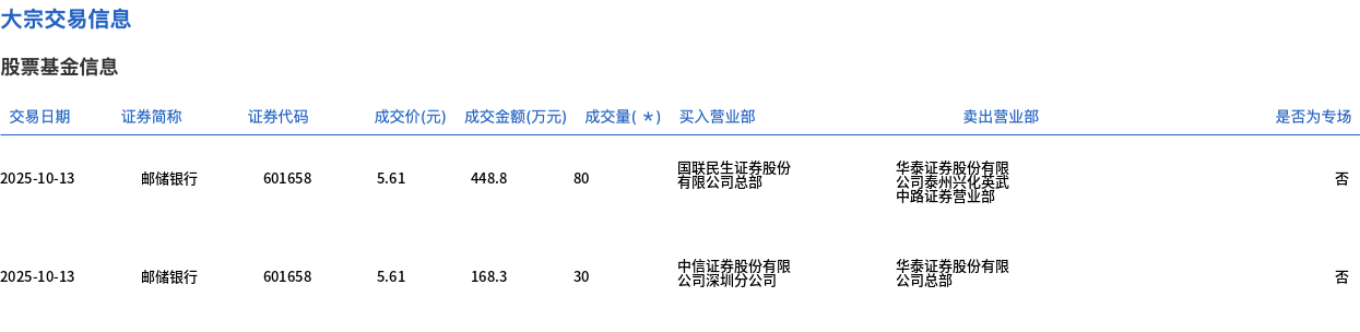 邮储银行今日大宗交易平价成交110万股,成交额617.1万元