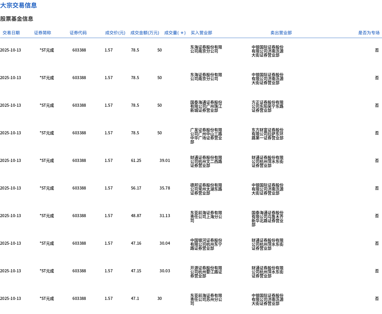 10月13日,*ST元成大宗交易成交395.99万股,成交额621.7万元,占当日总成交额的66.61%,成交价1.57元,较市场收盘价1.57元持平。