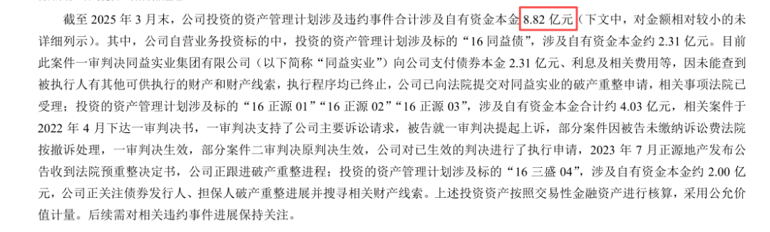 联合资信评级报告中称,截至2025年3月末,公司自营投资资产管理计划涉及违约规模较大,需对后续回收处置情况保持关注。