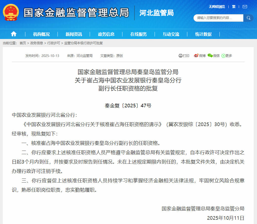 据国家金融监督管理总局河北监管局的批复文件显示,秦皇岛监管分局核准崔占海中国农业发展银行秦皇岛分行副行长的任职资格。