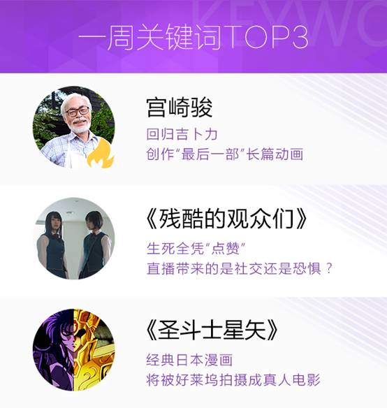 韩国影片《玉子》《之后》角逐金棕榈奖;宫崎骏回归,制作长篇动画电影;《残酷的观众们》等新剧首播;《圣斗士星矢》被拍成真人电影;东野圭吾《单恋》拍电视剧;金希澈确认担任KBS新综艺《锅垫》MC。