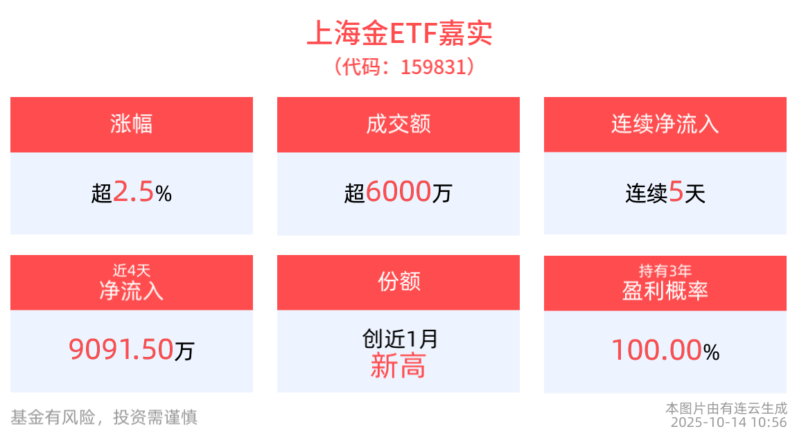 截至10月13日,上海金ETF嘉实近3年净值上涨128.21%。从收益能力看,截至2025年10月13日,上海金ETF嘉实自成立以来,最高单月回报为11.45%,最长连涨月数为6个月,最长连涨涨幅为8.28%。