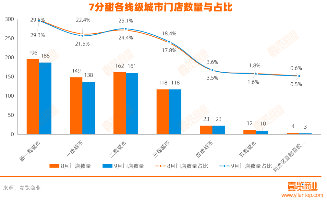 对比2025年8月,7分甜在下沉市场已出现初步拓展信号,但节奏仍偏缓。今年9月,7分甜的二线城市门店数达161家,占比25.1%,较8月提升0.7个百分点;三线及以下城市合计占比约24.1%,仍处低位。