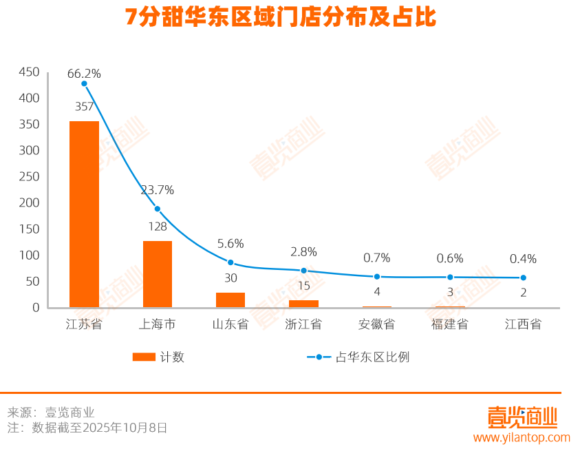 从门店分布上看,华东区域依旧是7分甜的大本营。