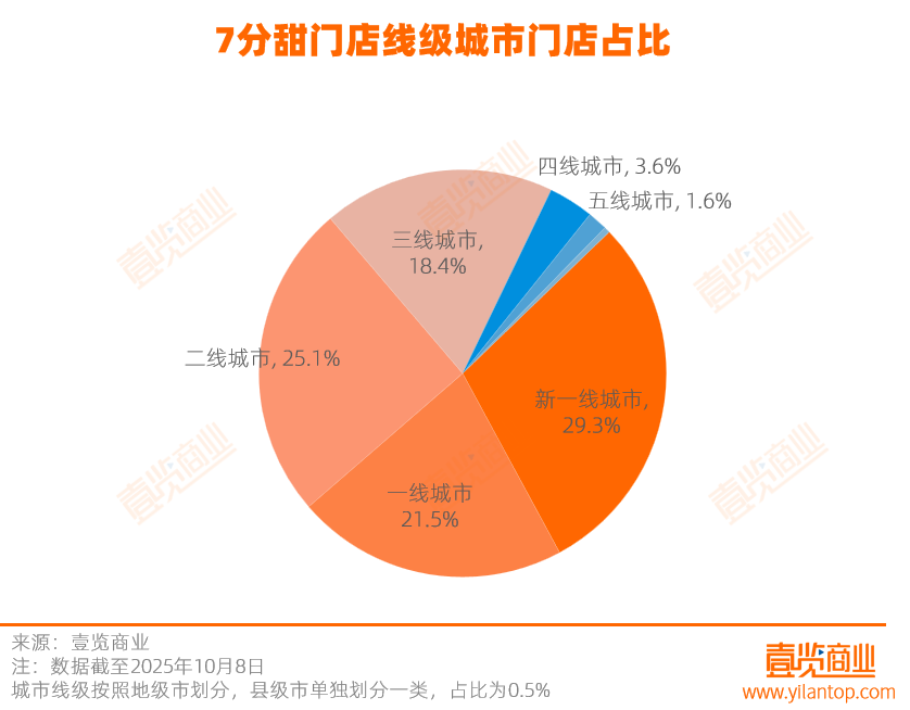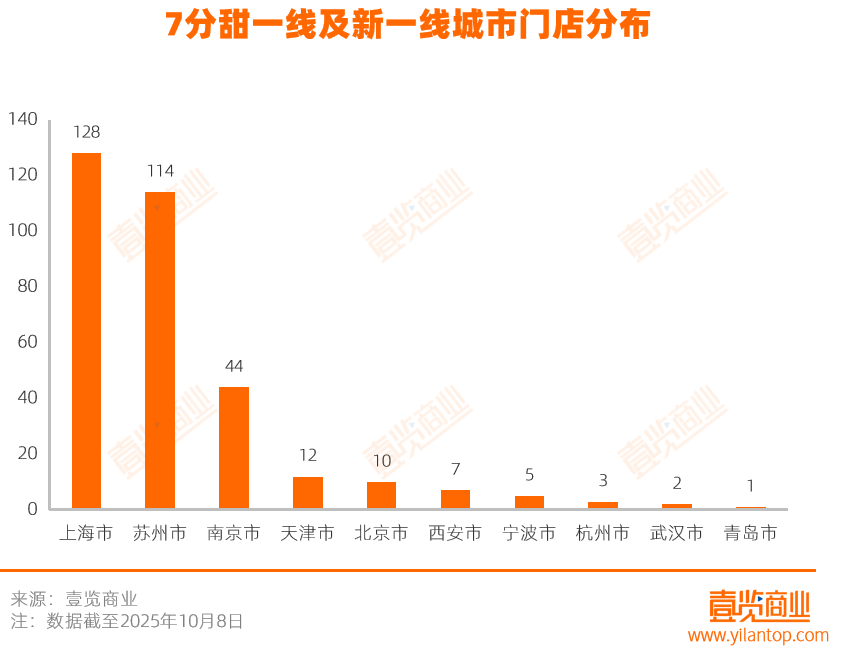 不过,7分甜的布局始终以高线城市为核心。截至2025年10月8日,7分甜在一线与新一线城市门店数分别为138家和188家,合计占比50.86%,构成其门店网络的半壁江山。