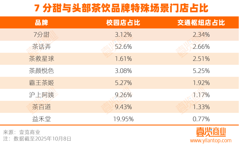 相比之下,7分甜在特殊点位的布局不仅数量少,且呈现收缩态势。壹览商业数据显示,截至10月8日,7分甜特殊点位门店数量为35家,环比下滑20.45%,占总门店的5.46%,低于行业活跃品牌的拓展速度。