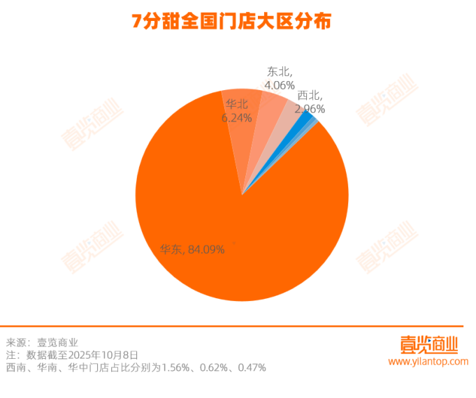 壹览商业数据显示,7分甜在华东区域共开设了539家门店,占全国总门店数的84.1%。紧随其后的华北区域拥有40家门店,占比为6.2%;东北、西北与西南三大区域的门店占比均低于5%,而华南与华中区域占比尚不足1%。