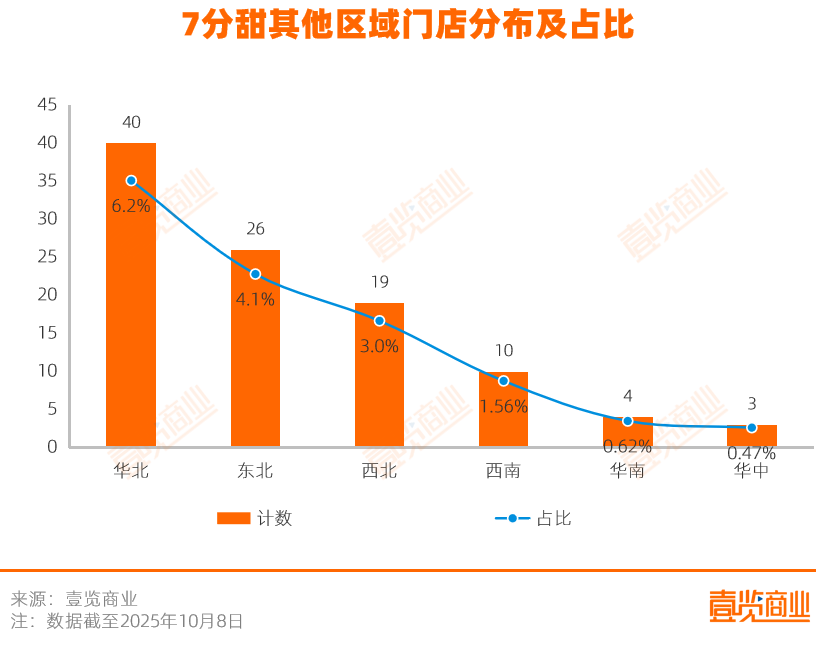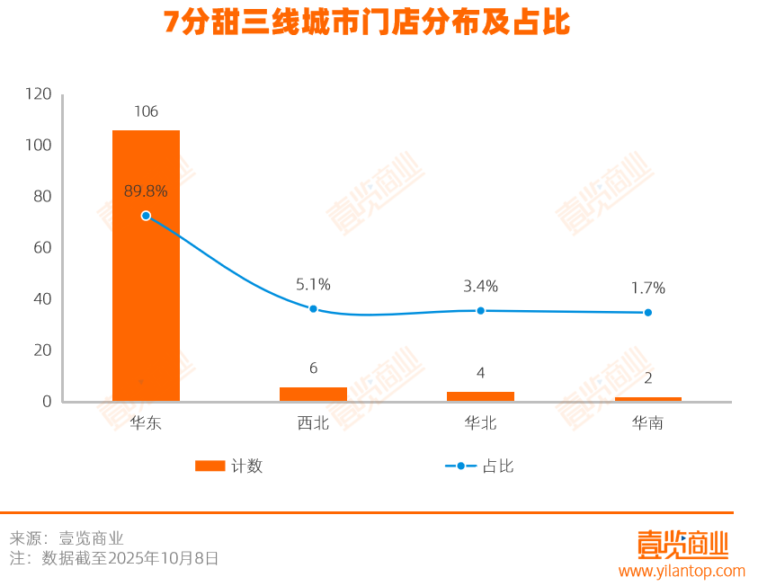 综合来看,7分甜目前仍为高度依赖华东市场的区域品牌,全国化进程尚处于起步阶段。其在华东以外区域门店稀疏,高线城市覆盖不全,下沉节奏缓慢,特殊点位布局薄弱,尚未形成系统化的全国拓展能力。
