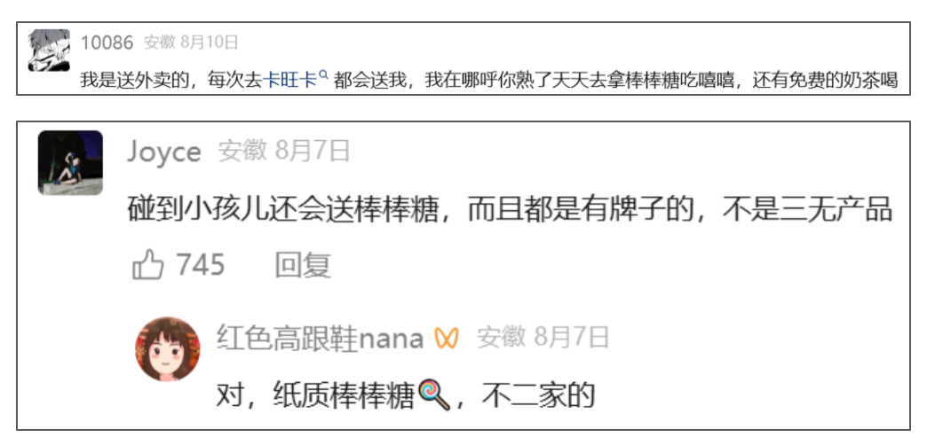 有给卡旺卡送过外卖的外卖员分享,他每次去卡旺卡,店员都会给他棒棒糖和免费奶茶喝。