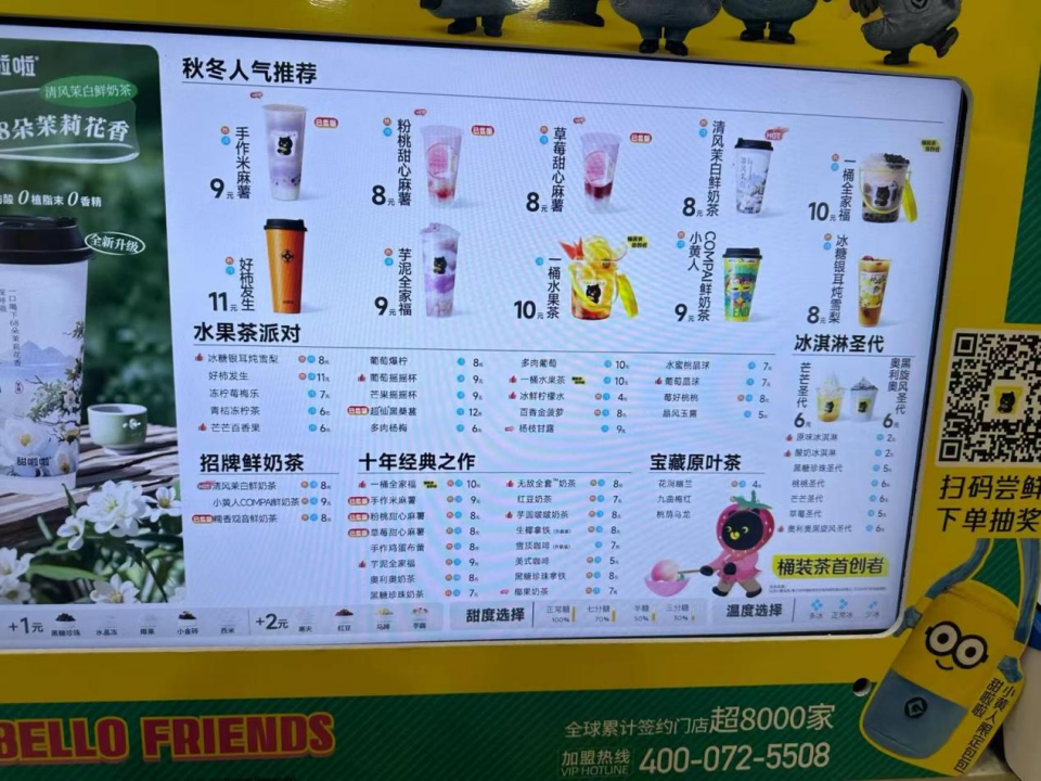 蜜雪冰城的芋圆奶茶、双拼奶茶售价9元;甜啦啦的全套奶茶售价9元,黑糖珍珠奶茶、红豆奶茶售价7元,堪称蜜雪冰城的“低价平替”。