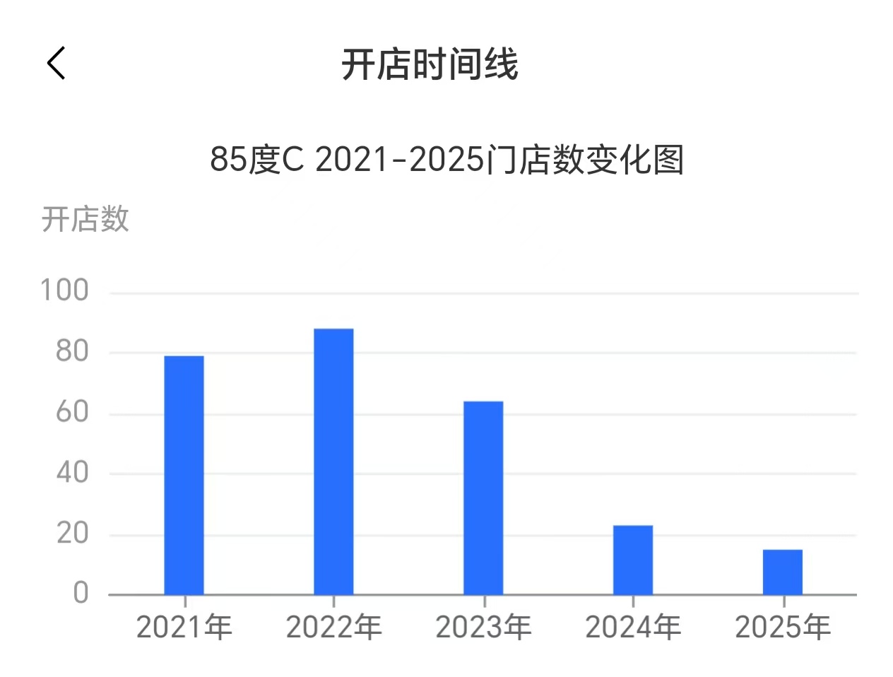 窄门餐眼数据显示,2022年,85度C开店接近100家,创下近5年来的新高。随后,该品牌新增门店数量不断走低,2024年开店数量降至20家左右。今年截至目前,其开店数量不足20家。