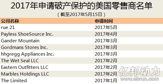 据外媒报道,2015年申请破产的美国零售商数量为16家,2016年是15家,而2017年这一数量更是激增。从今年年初至今,已9家零售商申请破产保护,除了rue 21之外,还有Payless ShoeSource、Gander Mountain、Gordmans Stores、hhgregg Appliances、Wet Seal、Eastern Outfitters、Marbles Holdings、The Limited,其中Wet Seal短期内两次破产。