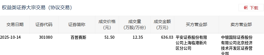 10月14日,百普赛斯大宗交易成交12.35万股,成交额636.03万元,占当日总成交额的3.41%,成交价51.5元,较市场收盘价54.86元折价6.12%。