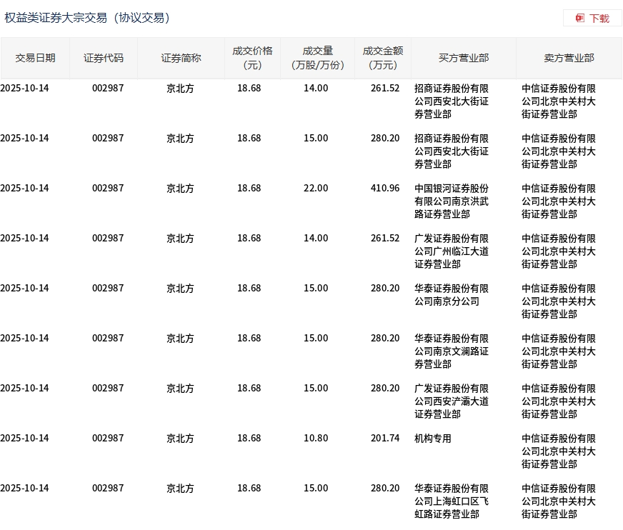 10月14日,京北方大宗交易成交135.8万股,成交额2536.74万元,占当日总成交额的4.5%,成交价18.68元,较市场收盘价20.99元折价11.01%。