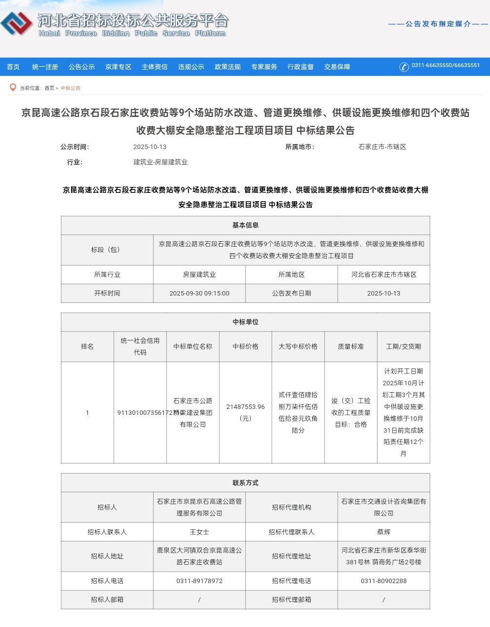 原标题:京昆高速公路京石段石家庄收费站等9个场站防水改造、管道更换维修、供暖设施更换维修和四个收费站收费大棚安全隐患整治工程项目项目 中标结果公告