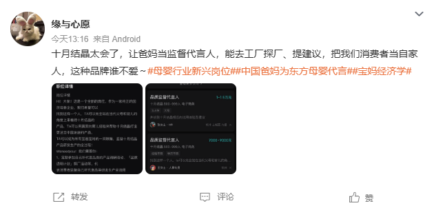 十月结晶的 “品质监督代言人” ,与传统代言人不同,这些父母不需要 “宣传产品优点”,而是要以 “使用者” 的身份,将自己的感官体验与场景反馈传递给品牌。这种 “体验式监督”,能帮助品牌填补专业质检的盲区,让产品从 “合格” 向 “好用” 升级。比如品牌若收到多位父母反馈 “纸尿裤腰部勒痕”,可以调整弹性带的材质与宽度;若收到 “辅食颗粒度不适” 的反馈,可以优化生产工艺,推出不同细腻度的产品版本。