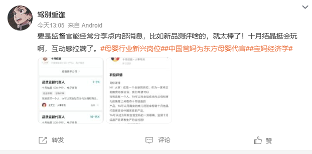未来,母婴行业或许需要建立更完善的 “体验质检机制”:比如品牌可组建父母体验团,定期收集感官反馈;行业可制定 “母婴产品体验评价指南”,规范反馈维度;甚至可推动 “体验数据” 与 “实验室数据” 同步公示,让消费者看到更全面的品质信息。而十月结晶此次招聘父母代言人的尝试,正是这种机制的初步探索 —— 它的价值不在于 “招聘了多少人”,而在于让行业意识到:父母的感官体验,也是母婴品质不可或缺的一部分。