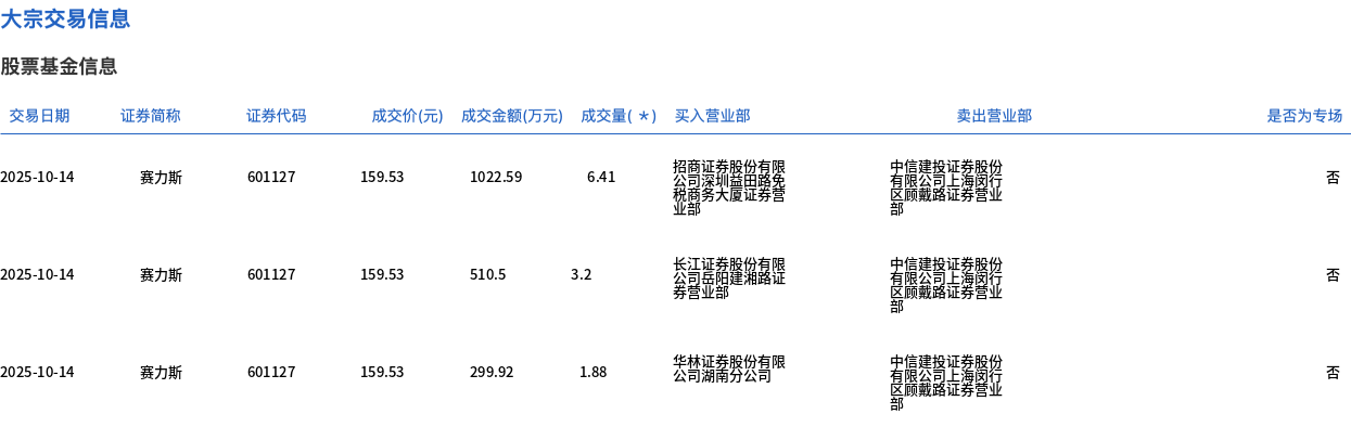 10月14日,赛力斯大宗交易成交11.49万股,成交额1833.01万元,占当日总成交额的0.33%,成交价159.53元,较市场收盘价159.53元持平。