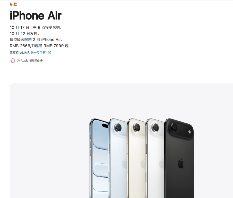同样是在10月13日晚间,苹果方面正式宣布,中国大陆用户可于10月17日早9点起预购iPhone Air,10月22日起正式发售。