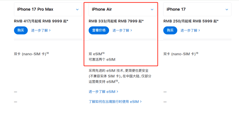 但在9月12日iPhone 17系列预售当天,iPhone Air缺席。同日苹果中国官网更新消息称:“中国移动、中国电信和中国联通将为本产品(iPhone Air)提供eSIM支持,具体时间依监管部门审批情况而定。”