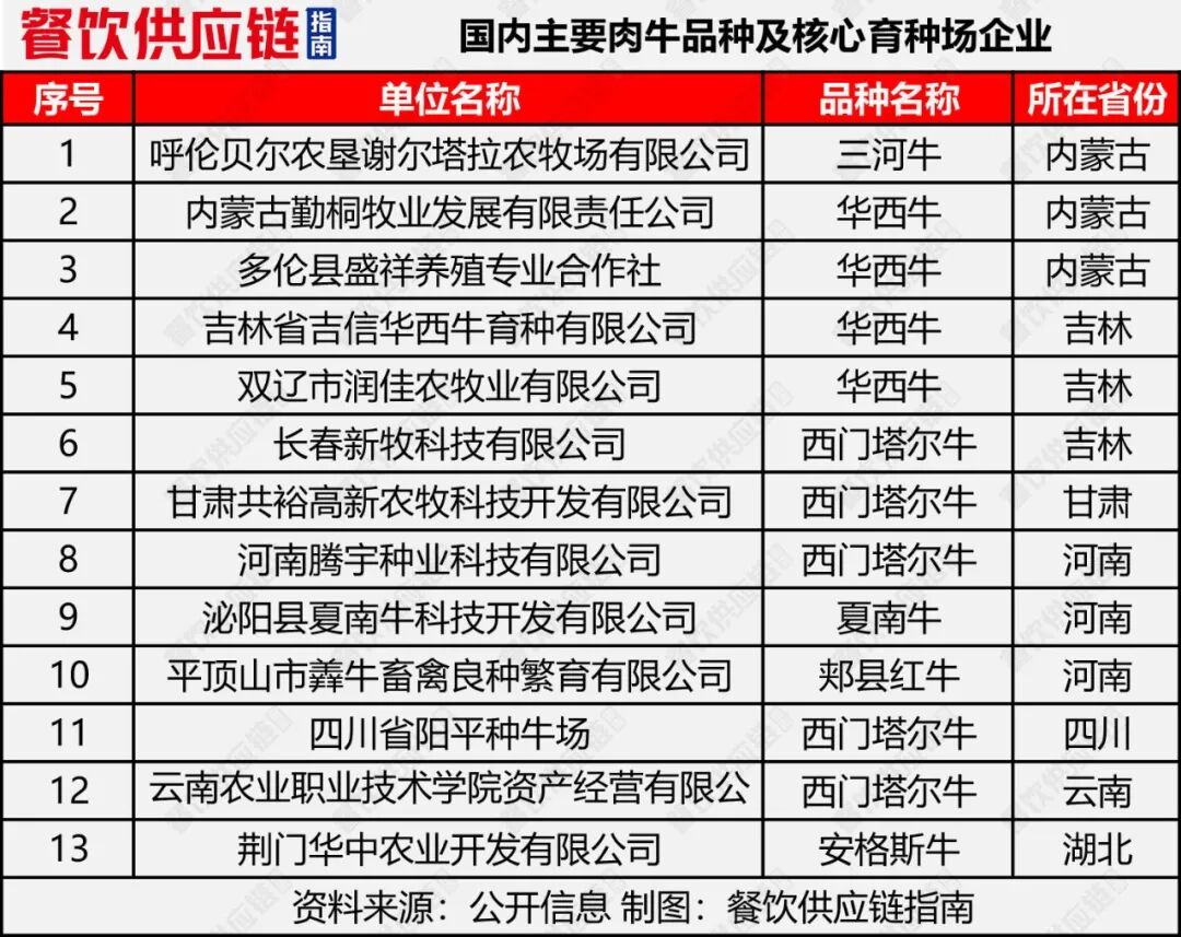 根据农业农村部今年3月公布的2024国家畜禽核心育种场增补名单,现有国家肉牛核心育种场地共13家,含今年新增的5家。也有部分企业自研繁育,如内蒙古中农兴安种牛科技有限公司纯种牛繁育分公司。