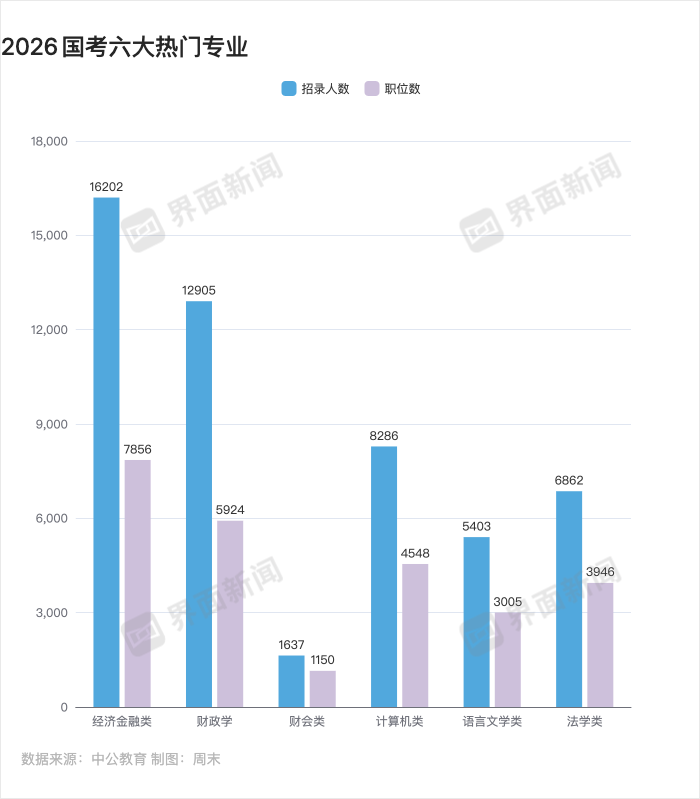 具体专业需求上,中公教育公考专家李茜对界面新闻表示,经济类、财政学、金融类、计算机类、法学类和财会类专业人才需求量最大,其中经济金融类、财政学类需求量最大,这也与招录主体税务系统相匹配,需要大量经济类人才。