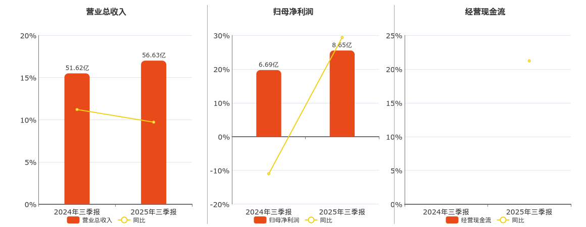 2025年10月15日,锦浪科技(300763.SZ)发布2025年三季报,营业总收入为56.63亿元,同比较去年同期上涨9.71%,归母净利润为8.65亿元,同比较去年同期上涨29.39%。