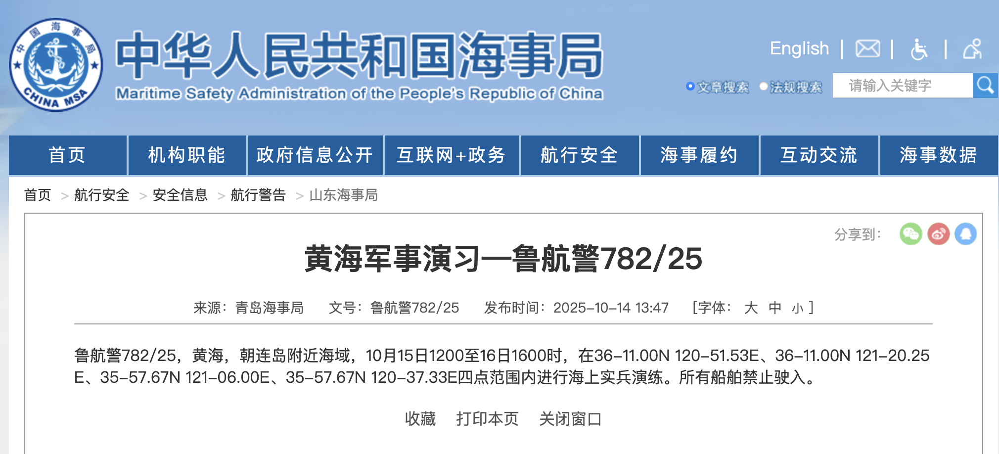 据中国海事局网站消息,青岛海事局发布航行警告,10月15日12时至16日16时,黄海朝连岛附近海域进行海上实兵演练,所有船舶禁止驶入。