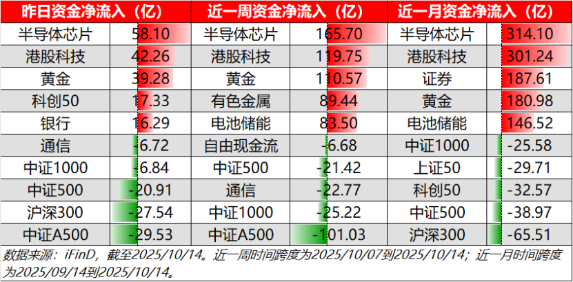 从日、周、月三重维度出发,半导体芯片、港股科技和黄金延续资金青睐,三重维度持续位居资金净流入前列。特别是半导体科技和港股科技,始终处于资金净流入前二。