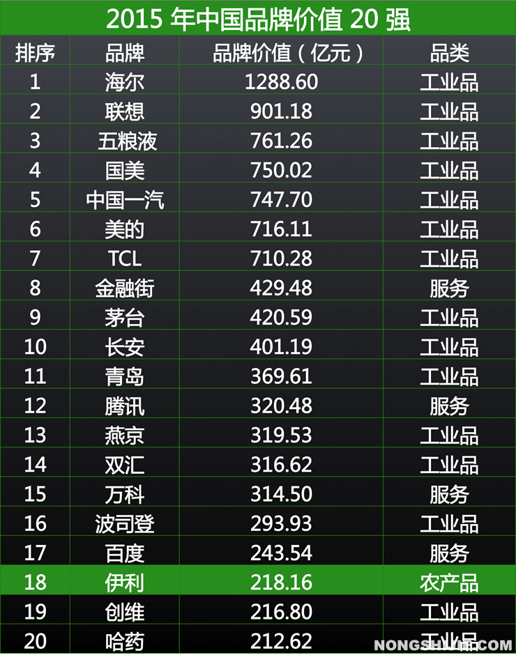 ▲在 2015 中国品牌价值 20 强中,伊利是唯一的农产品品牌。来源:中商情报网