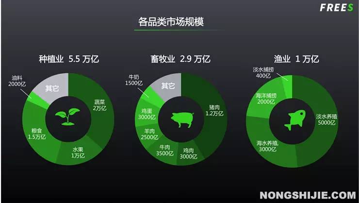 ▲农产品品类大致可以按照种植业、畜牧业、渔业划分,加起来大概是一个10万亿的市场。(图中规模为产地价,即农产品在生产者所在地的交易价格。)