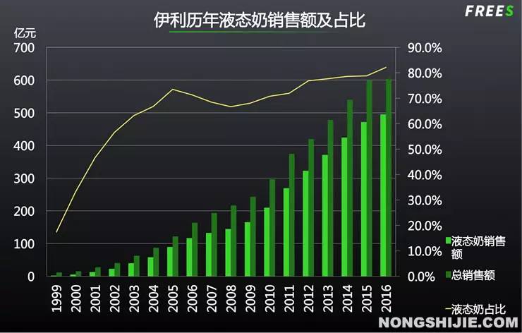 短短时间内,伊利将盒装牛奶销往全国各地,由地方性企业崛起成为中国乳业巨头。2000 年,伊利液态奶收入达 5 亿元人民币,而2015 年时,伊利年营业收入已突破 600 亿元人民币,其中 80% 由液态奶贡献。