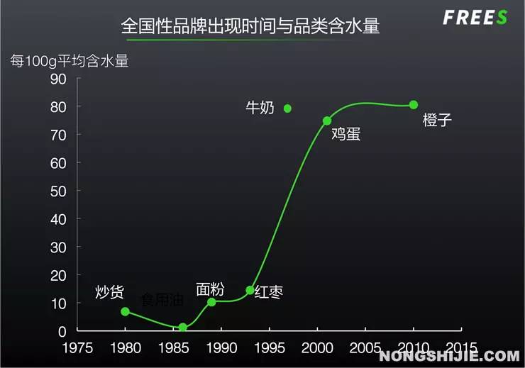 ▲ 含水量较低的品类,出现全国性品牌的时间较早